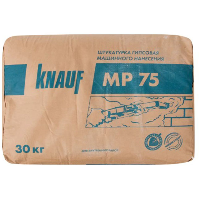 Knauf МП 75 — гипсовая штукатурка, разработанная специально для машинного нанесения с использованием штукатурных станций. Используется для выравнивания стен и потолков внутри сухих помещений и позволяет существенно сократить сроки отделочных работ.